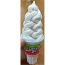 Нежное кремовое мороженое с клубничным джемом в вафельном рожке.